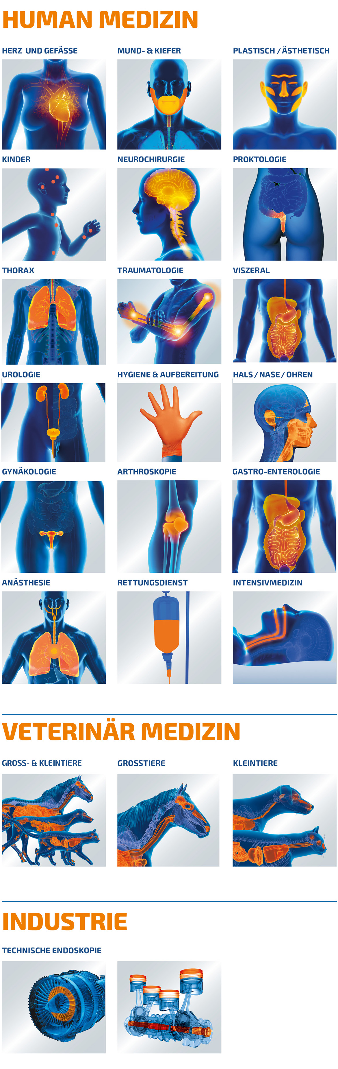 Die diversen Sparten und Kategorien werden durch High-Tech Illustrationen repräsentiert. Die Highlights in der Komplementärfarbe Orange helfen zusätzlich bei der Orientierung.