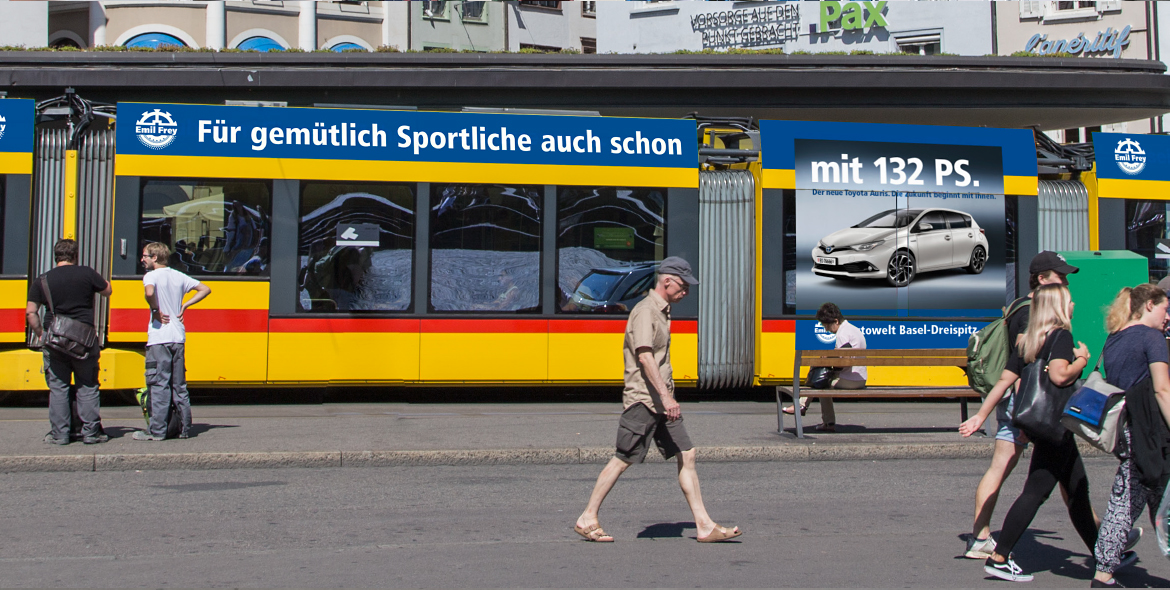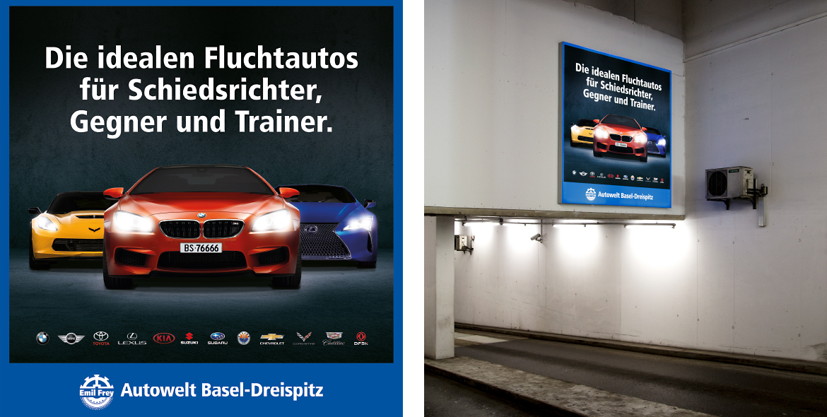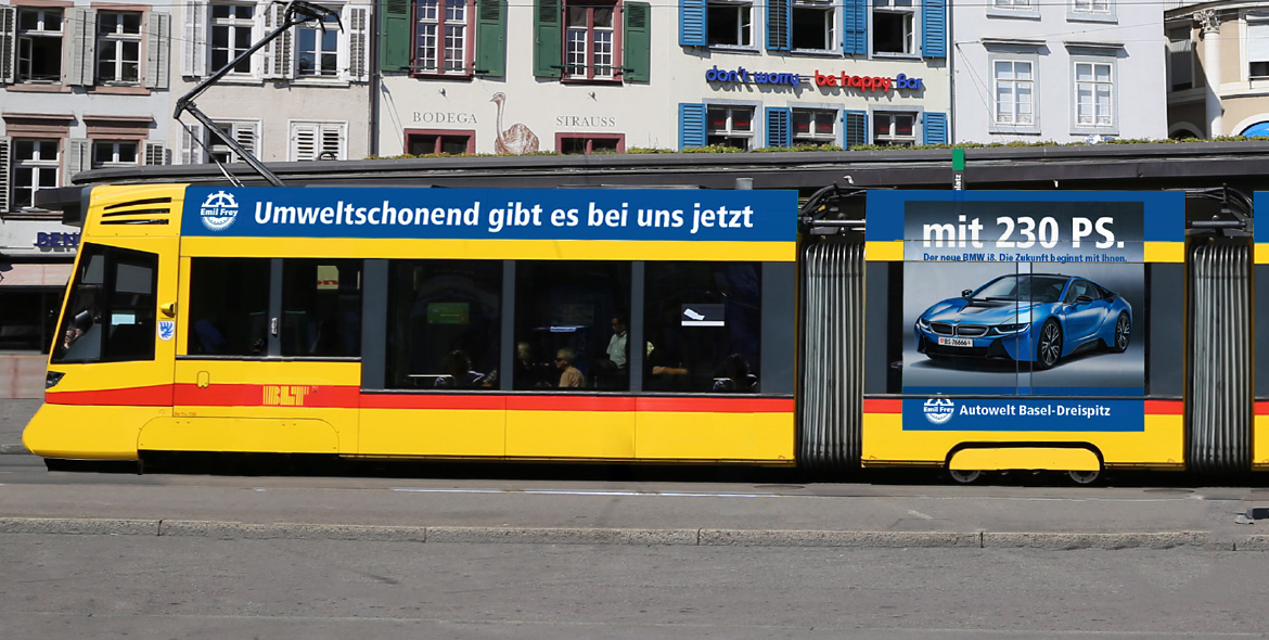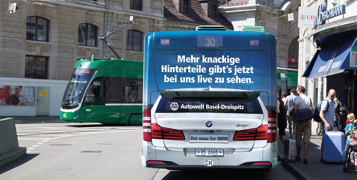 Für die Parkhauseinfahrt des St. Jakob Parks Basel, die Heimat des 20-fachen Schweizer Fussball-Meisters FC Basel, entwickelten wir ein ortsbezogenes Sujet mittels einer speziell angefertigten Leuchttafel. Mit Heckbeschriftungen auf Basler Linienbussen sowie auf dem 11er Tram der Baselland Transport AG, wurde ebenfalls medium- und zielgruppenbezogen für Aufsehen gesorgt. In beiden Fällen galt es, die enorme Angebotsvielfalt der Autowelt Basel Dreispitz aufzuzeigen. Als Full-Service-Agentur waren wir neben der Gestaltung und Produktion auch für die gesamte Mediaplanung zuständig – was sich für Fünfstern-Kunden immer wieder bezahlt macht. Denn der Aufwand des Kunden beschränkt sich somit auf ein administratives Mindestmass und verschafft ihm wertvolle Zeit für sein operatives Tagesgeschäft.