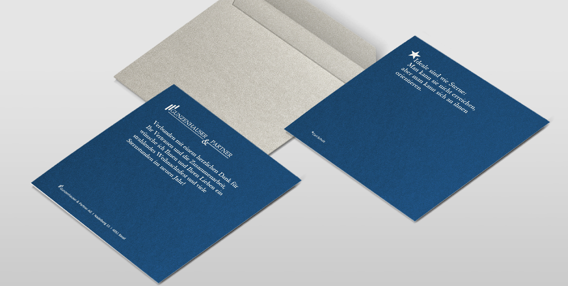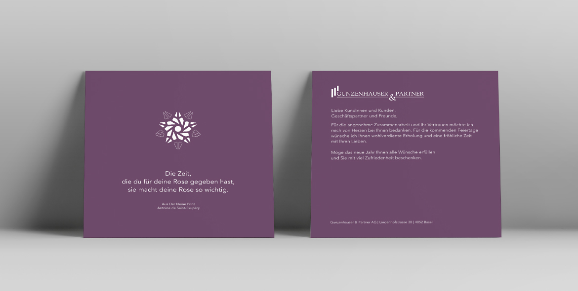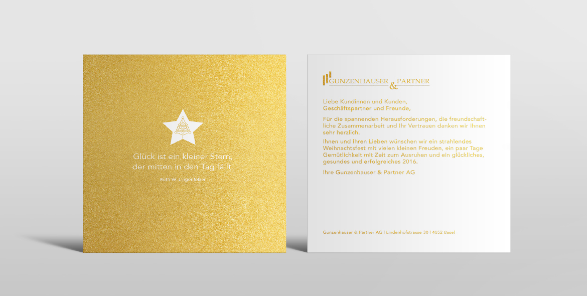 Seit 2013 betreut Fünfstern Gunzenhauser & Partner in allen Kommunikationsbelangen. Ein medienübergreifendes Wording-Konzept war Ausgangspunkt für den neuen Kommunikations-Auftritt, bei dem Klarheit und Vertrauen als zentrale Kriterien für Finanz- und Steuerfragen definiert wurden. Das gesamte Konzept unterstreicht die persönliche, vertrauensvolle und sympathische Betreuung, die man als Kunde bei Gunzenhauser & Partner geniessen darf. Mit eigener Bildwelt, Webkonzept inklusive Programmierung und den alljährlichen Weihnachtskarten unterstreichen wir die ehrliche Beziehung, welche Gunzenhauser & Partner zu ihren Klienten pflegt.