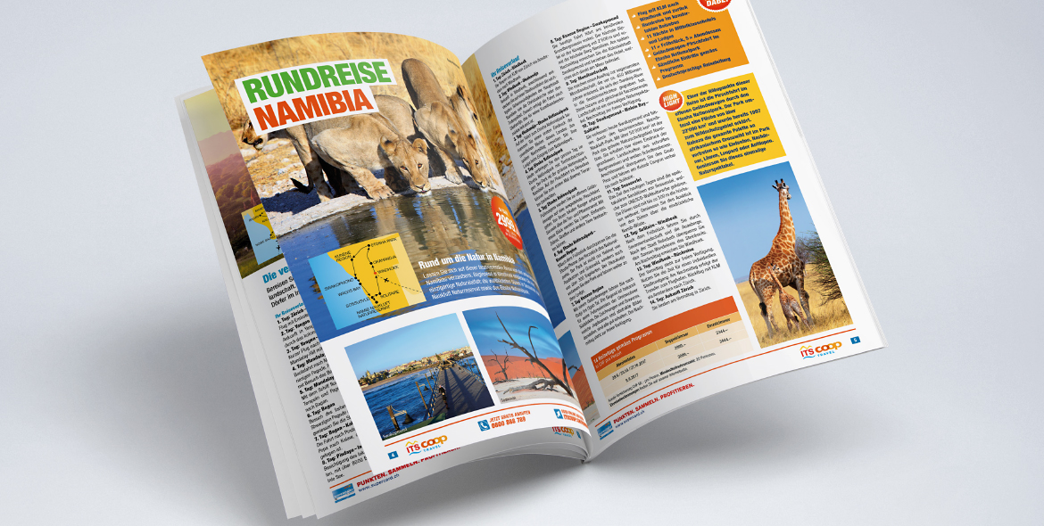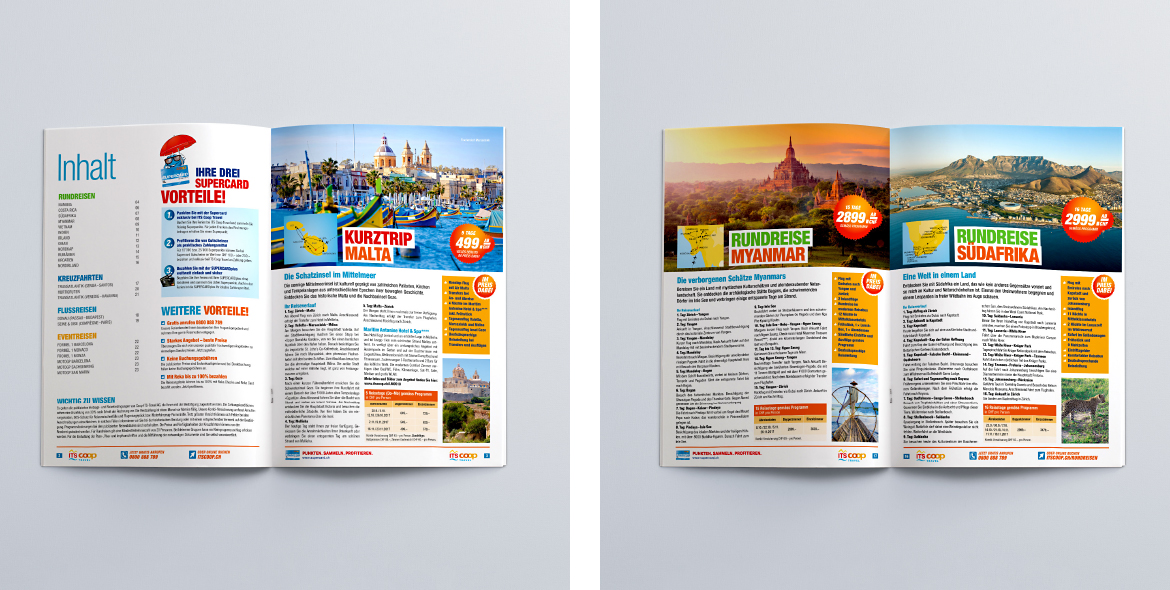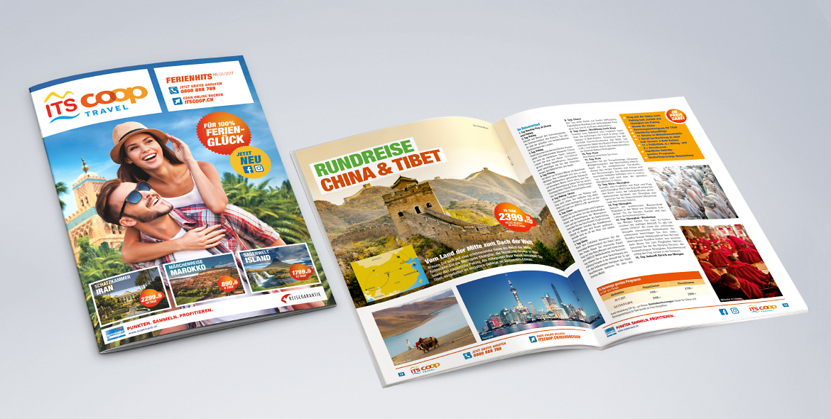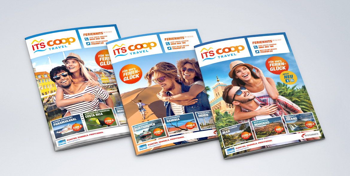 Das Buchungsgeschäft für Winter- und Sommer-Badeferien hat in der Schweiz traditionell von Dezember bis Februar Hochsaison. Um ein alternatives, ganzjähriges Gefäss für Schiffs-, Rund,- Event- und Städtereisen zu etablieren, entwickelte Fünfstern für und mit dem Kunden die 4–6 mal jährlich erscheinenden «Ferienhits», welche wir 2017 einem Facelift unterzogen. Aus der eigenen langjährigen Erfahrung im Tourismus-Geschäft profitierend, konnte Fünfstern zusammen mit ITS Coop Travel ein Verkaufsinstrument entwickeln, das nicht nur gestaltet, sondern auch von Grund auf mitkonzipiert wurde – Partnerschaft at its best.