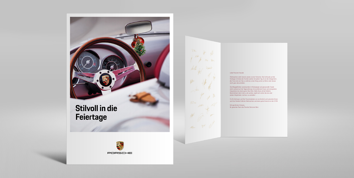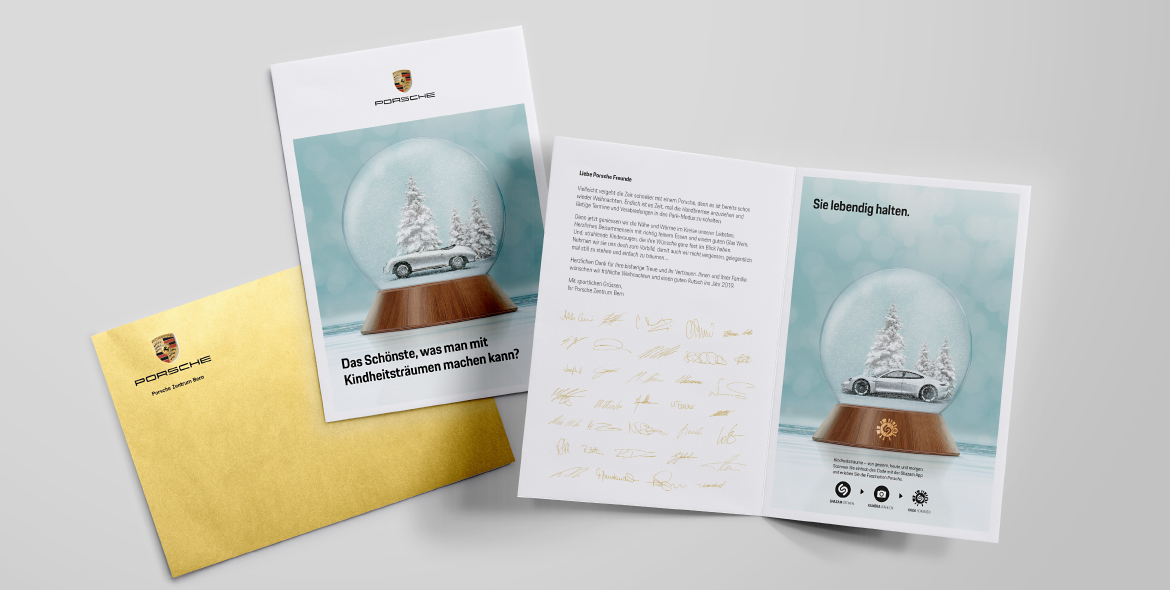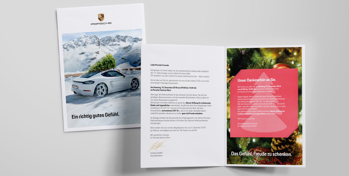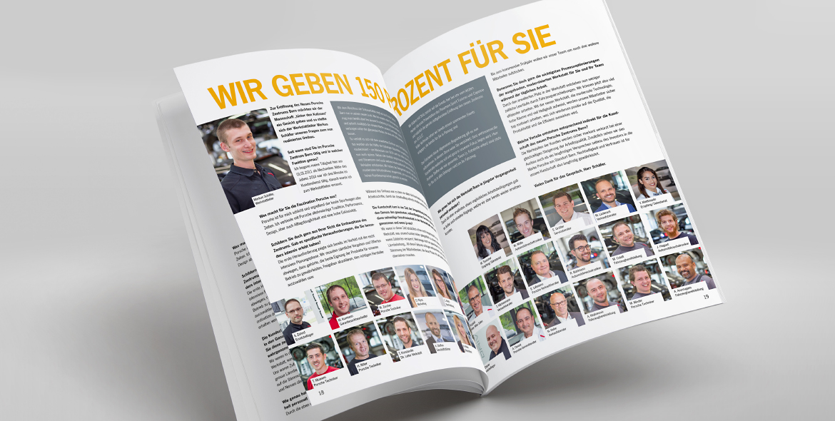 Da die legendären Sportwagen nicht nur Kundenherzen höher schlagen lassen, sondern auch «Werber-Köpfe» höher takten, ist es uns immer wieder eine Freude, die Niederlassung Bern auf vielfältige Weise kommunikativ zu unterstützen. So zeigt sich Fünfstern für unterschiedliche Massnahmen wie Anzeigen, Einzelwerbungen, Direct Mailings, Online Banner und Einladungen verantwortlich und betreut Porsche Bern auch redaktionell. Für das vierteljährlich erscheinende Magazin «Porsche TIMES» liefern wir die jeweiligen Editorials sowie Artikel, die den Standort Bern direkt betreffen.