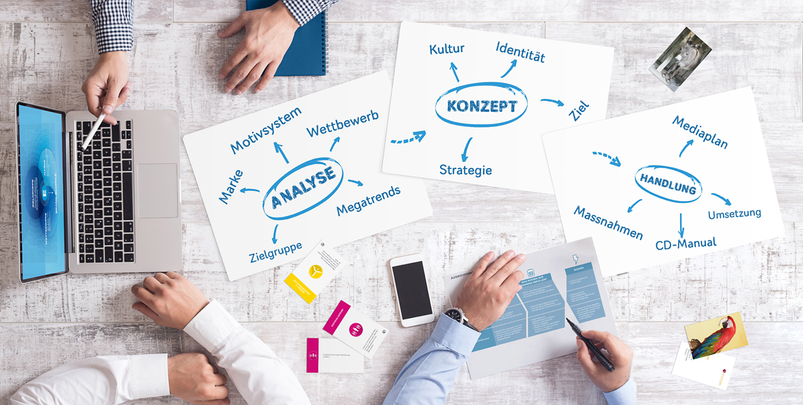 Um die Kommunikation der ambitionierten Marke auf solide Beine zu stellen, boten wir dem Team zunächst einen Identifikations-Workshop an. Es galt, ihre Ideen zu strukturieren und anhand einer schlüssigen Corporate Identity zu kanalisieren. Nach Erarbeitung von Identity-Bausteinen wie der Kernwerten oder der Zielsetzungen war die Markenessenz geschaffen. Darauf aufbauend konnte der Prozess der Namensfindung und die Entwicklung des Corporate Designs in Gang gesetzt werden. Als Leitbild für die Unternehmensführung und deren Mitarbeiter liegt nun ein «Brand Book» vor, welches die Inhalte des gesamten Workshops anschaulich und prägnant aufzeigt.