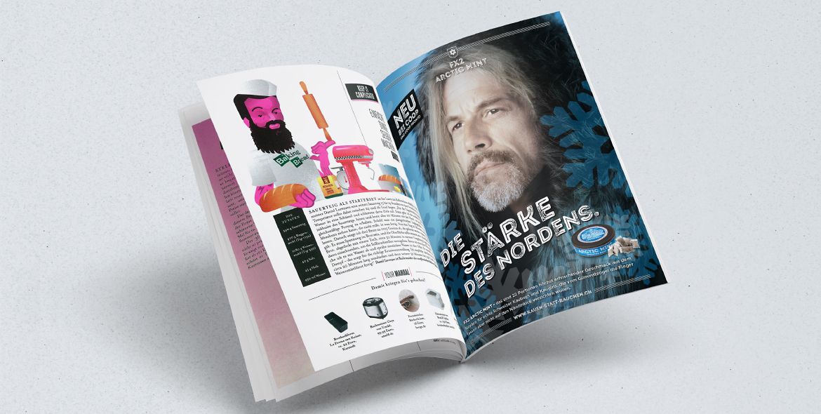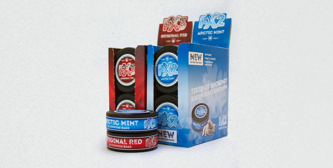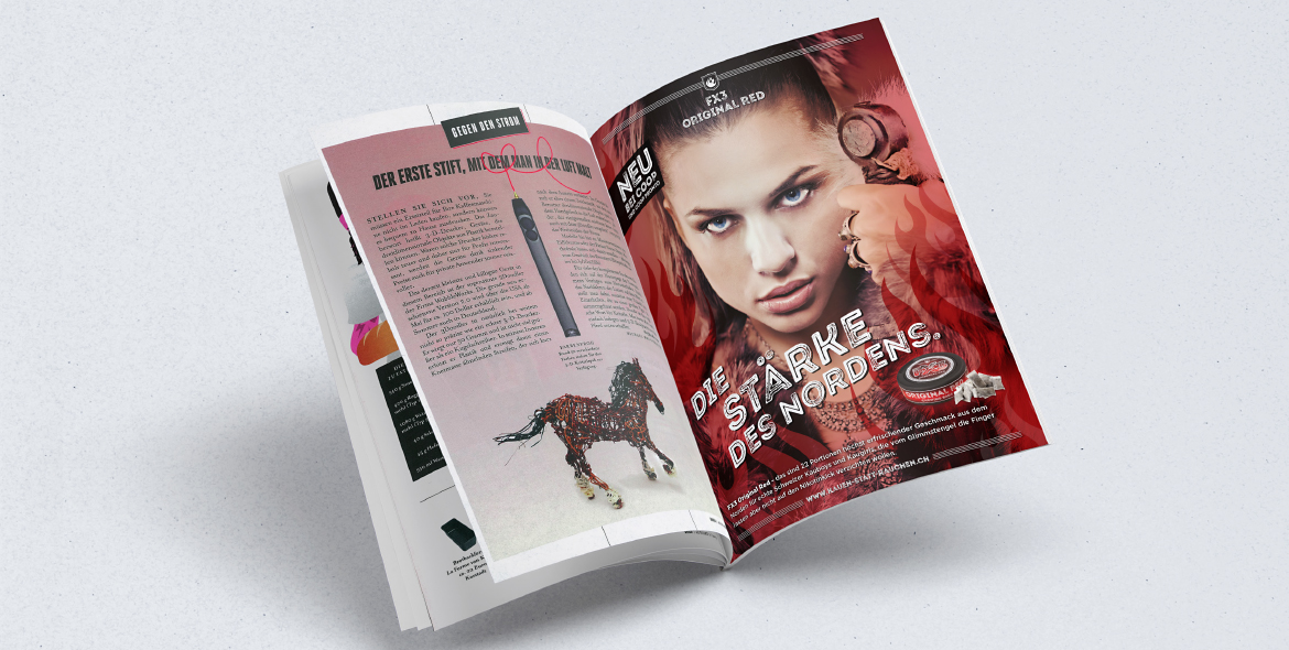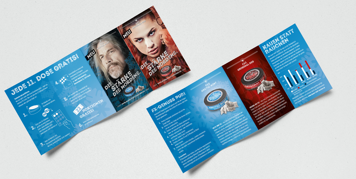 Im Rahmen ihrer Snus Produkte-Lancierung entwickelten wir für die zwei Produktelinien FX2 und FX3 das jeweilige Markenbild, Packaging und verschiedene Kommunikations- sowie POS-Massnahmen. Die unterschiedlichen Bildwelten liessen wir im Rahmen eines klein angelegten Fotoshootings entstehen. So entführten wir den «FX2 Arctic Mint» Snuser in die eisige Welt der Inuit. Den Snuser des weitaus stärkeren «FX3 Original Red» luden wir zur Assoziation lodernder Wikinger-Flammen. Die anschliessende Marken-Einführung erfolgte in Form von Anzeigen, Plakaten, Promo-Displays, Leporellos sowie Online Bannern.